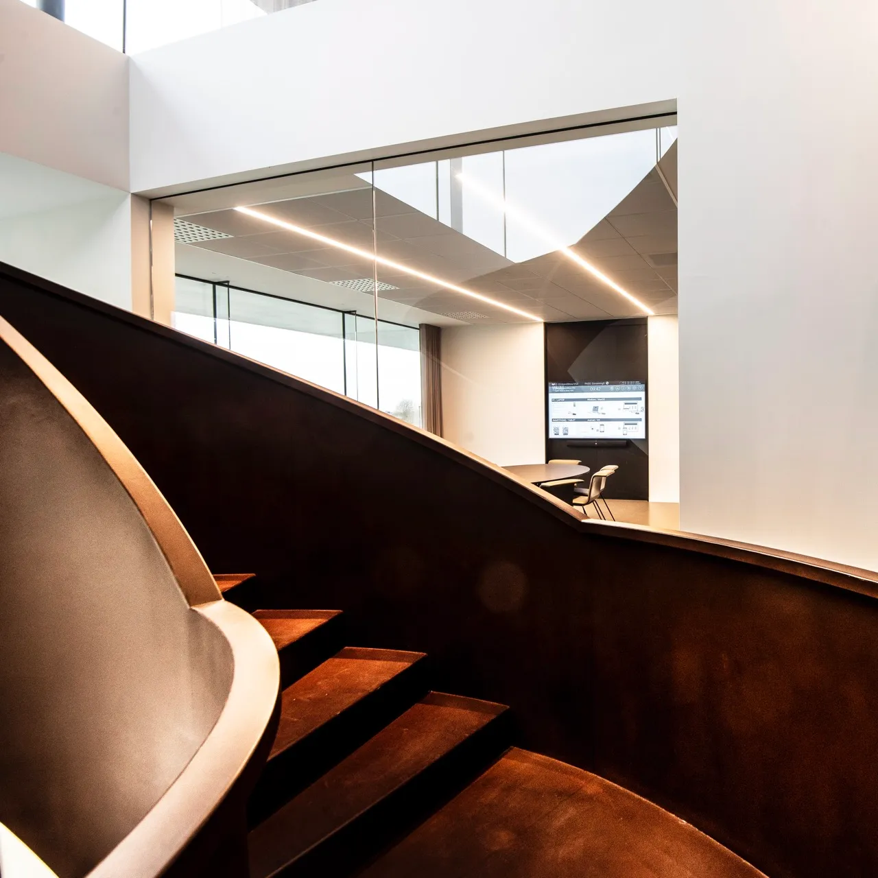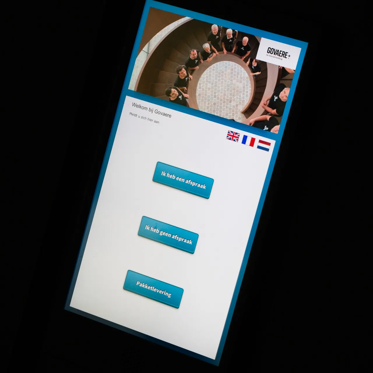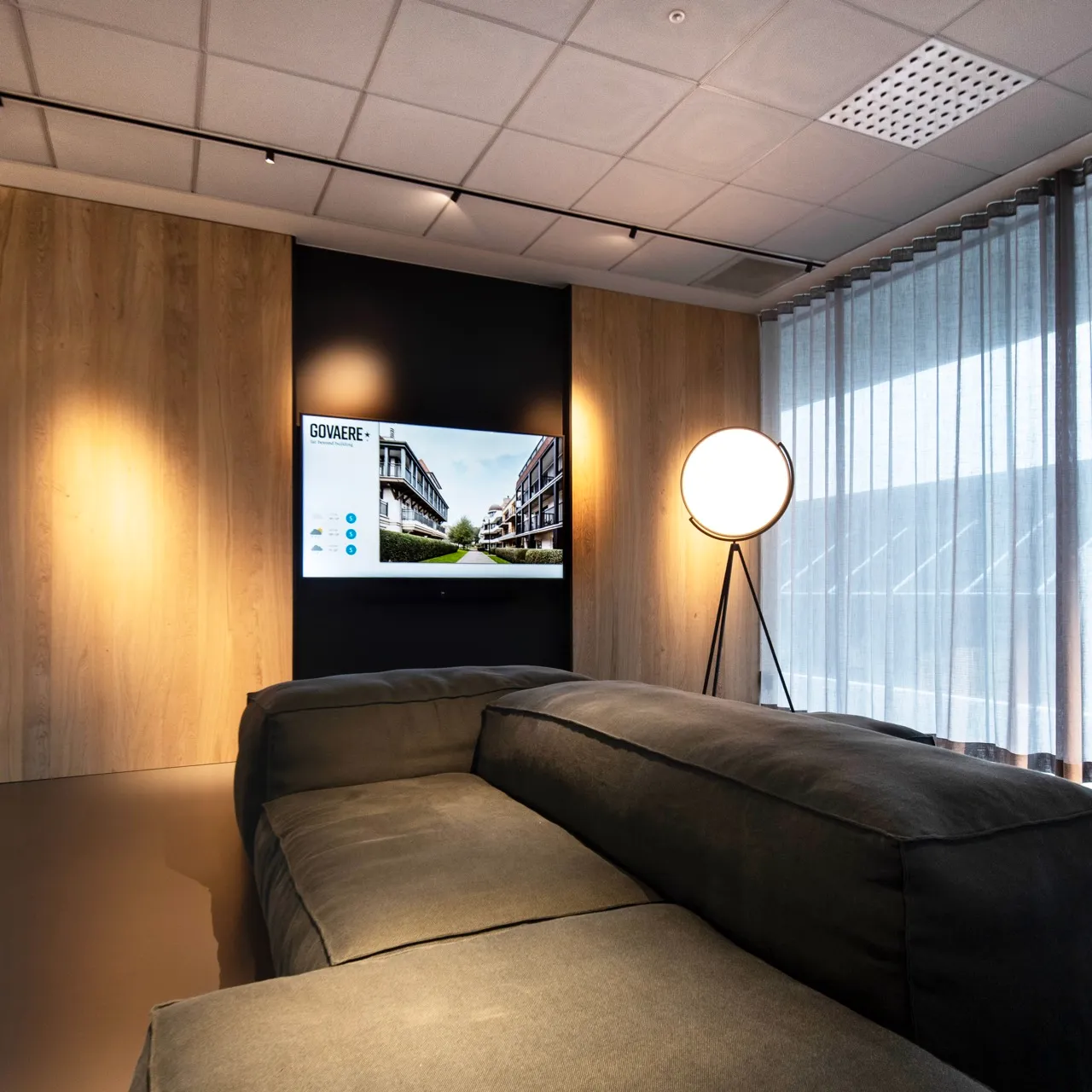 “De bureaus van ons nieuwe kantoor in Kuurne bevinden zich op de eerste verdieping, de receptie bevindt zich beneden. Die hebben we ingericht als een digitale receptie, waar bezoekers zich kunnen aanmelden via een scherm. De medewerker met wie ze een afspraak hebben, ontvangt vervolgens een melding en kan zijn bezoeker binnenlaten vanop afstand. Terwijl ze wachten, kunnen mensen even plaatsnemen in de wachtruimte, waar we een slideshow van onze realisaties laten afspelen op een scherm. In onze kantoorruimte op de eerste verdieping integreerde Van Gils monitors die we gebruiken voor interne besprekingen en projectvoorstellingen. Via hun laptop, iPad of iPhone kunnen onze vertegenwoordigers er makkelijk beelden op projecteren. Een efficiënt én inspirerend communicatiemiddel, want één beeld zegt meer dan duizend woorden.”