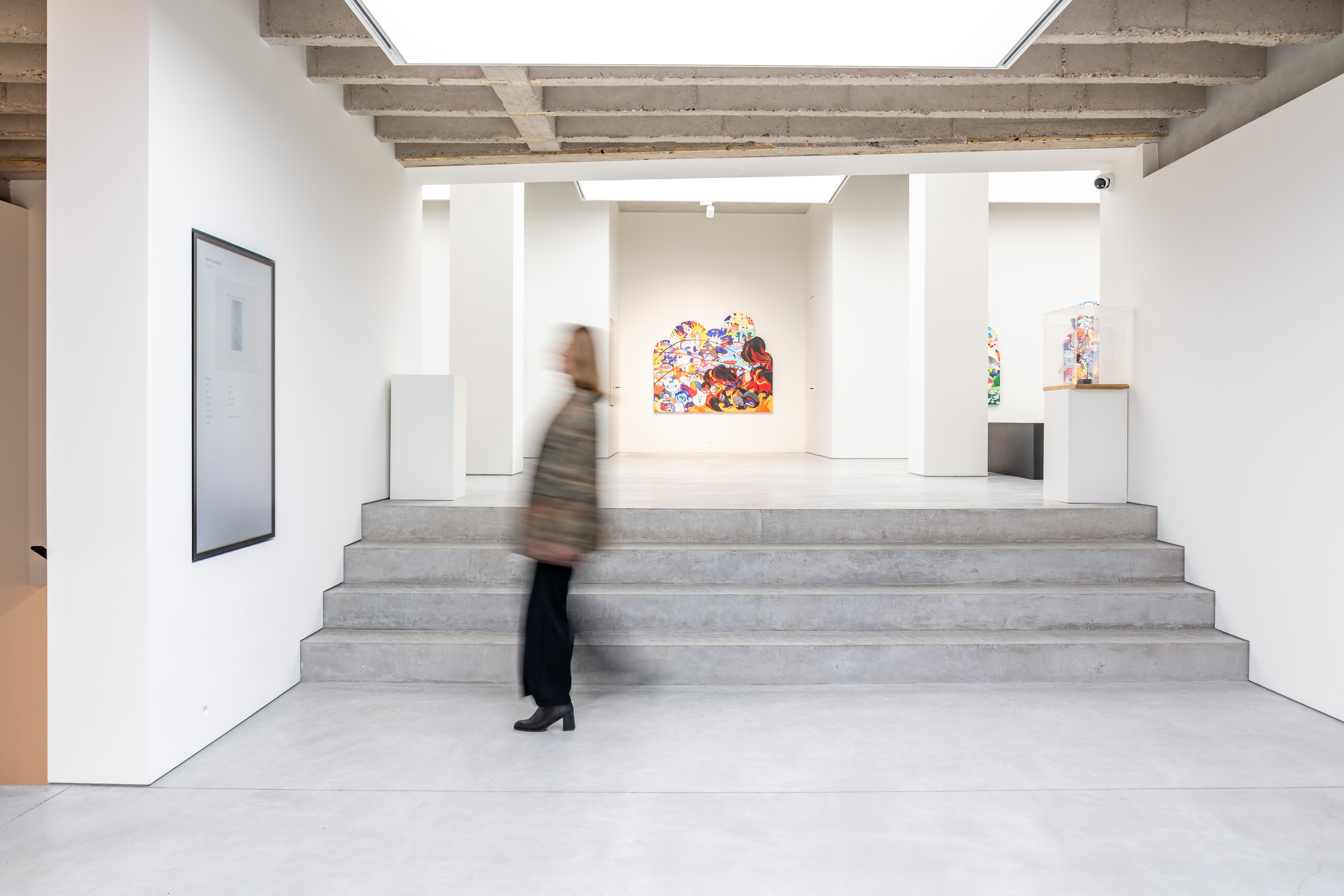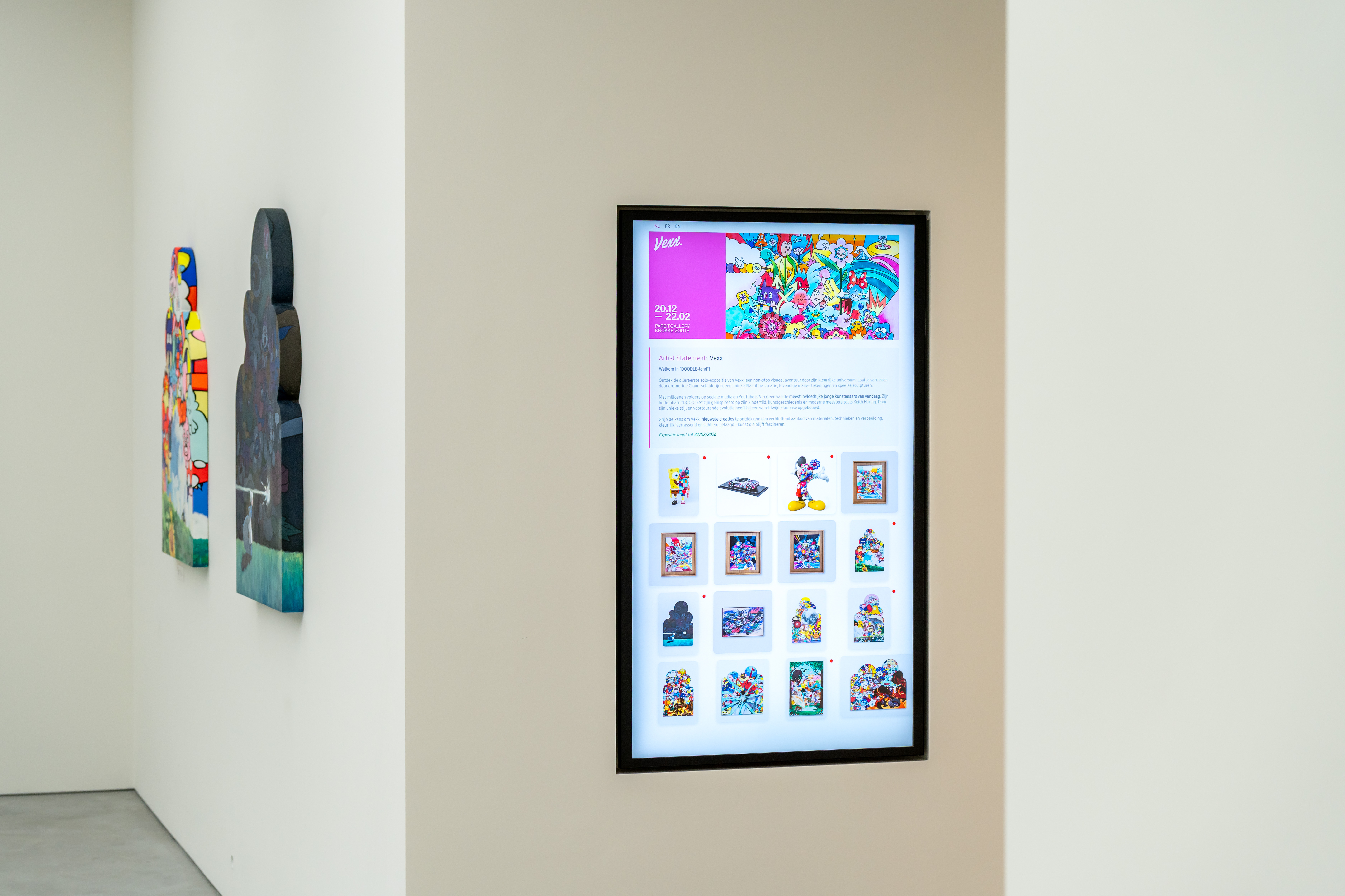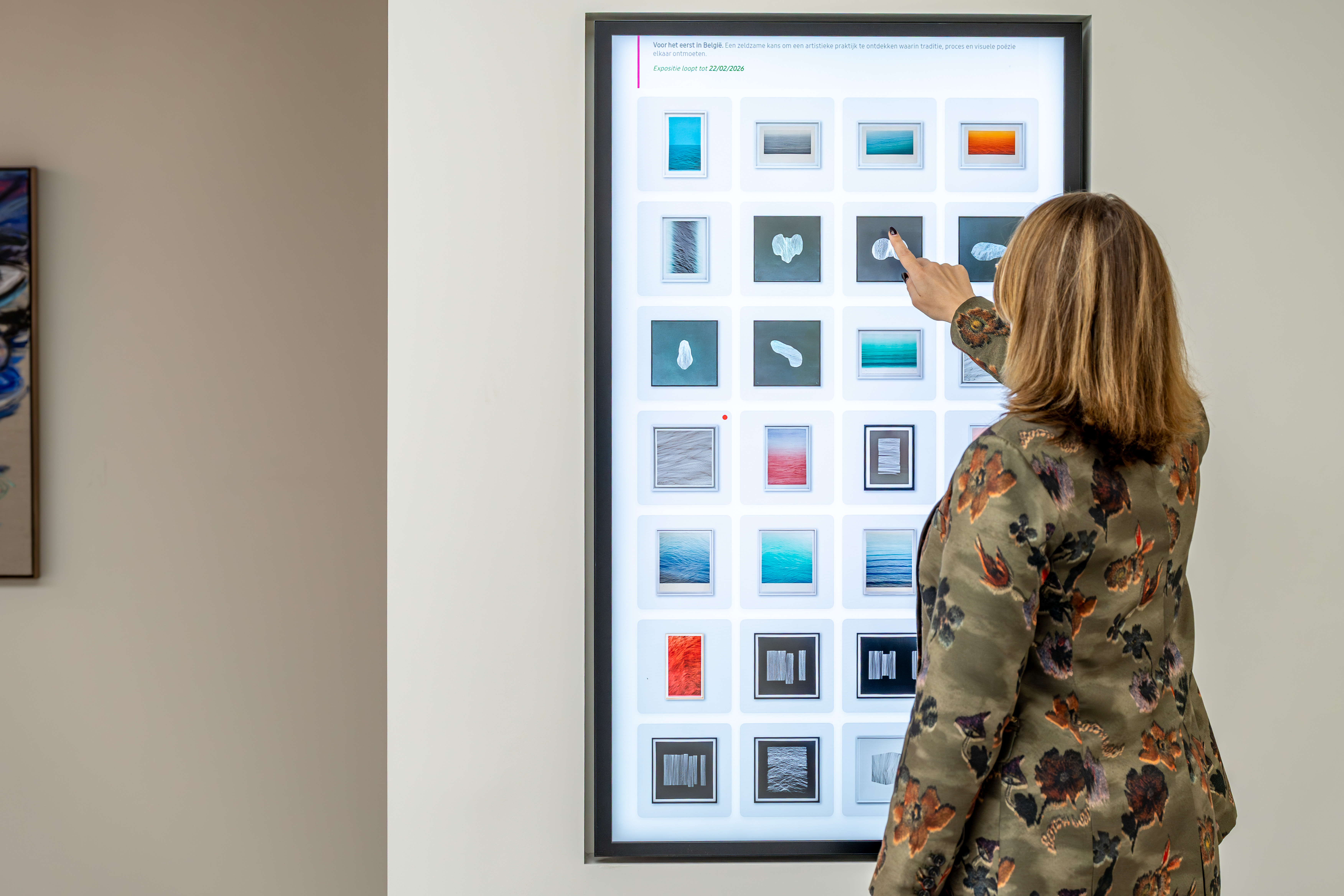 De schermen zijn subtiel geïntegreerd in de architectuur en versterken de beleving zonder de kunst te domineren.